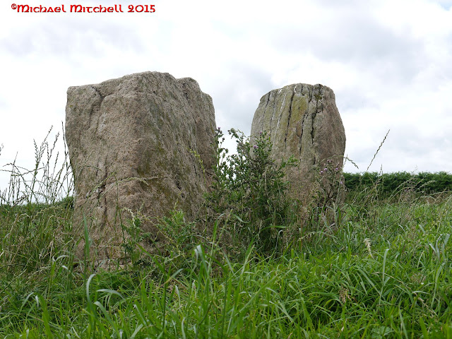 The route to Glanbrack takes me past Maulatanvally stone circle then taking the next right and following the lane past a right hand turn and a house on the left, just beyond of which is a small layby by some forestry. Back a few yards on the opposite side of the road is a gate leading to a track. Follow the track up (which is quite overgown in places) This will eventually lead to Glanbrack circle in a field to the right. Accompanying the circle is also a Stone Pair. This small alignment is set NE-SW and is around 3.5m from the circle. Both stones are of a similar size - around 1m in height.