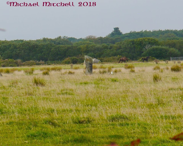 Next, we head over to Crousa Common. Theres a spot to park at the cross roads by the common. A stone pair sit on the Common, but finding a way to them is seeming impossible. Walking along the road, I can make them out over the hedge. One is standing and the other has fallen. There does seem to be a gate into the very large field down at the far end, but there are a lot of horses in there, so I have to make do with a long range photo over the hedge. It's a shame, as the standing stone looks quite large. Next time !!!!